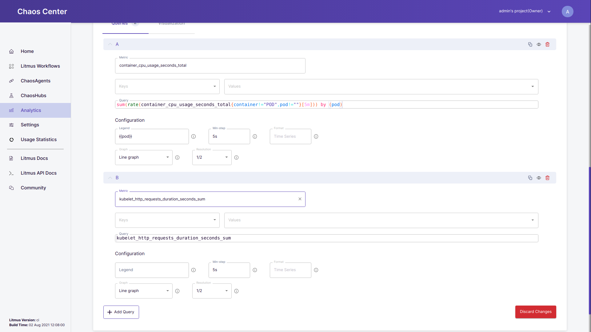 • Add a panel: Every individual tab in the Tune the queries header section corresponds to a panel. For example in the image given below Chaos-Pod-CPU Usage and Chaos-Pod-Memory Usage both are individual panels. To add another panel simply click on + Add Panel and a new panel will appear with the name Untitled Panel.